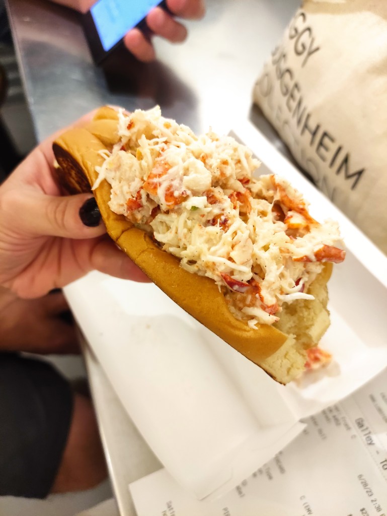 - Giorno 6: non siamo potuti andare al MET perché non avevamo prenotato in anticipo e non c’erano più posti, né per quel giorno né per il giorno dopo. Pazienza, ci rifaremo. Ne abbiamo approfittato per passeggiare tantissimo e fare su e giù con la metro tra Manhattan e Brooklyn. Ovviamente avevamo l’abbonamento settimanale ai mezzi, e con circa 33 dollari, tasse comprese, potevamo prendere la metro quante volte volevamo. Quindi Ghostbuster Headquarter e giro in zona. Poi giretto a Brooklyn con tappa all’Industry City per merenda con caffè, banana bread e cookies giganti con gocce di cioccolato. Ritorniamo su verso Dumbo ma il Transit Museum era chiuso temporaneamente – e la cosa non era segnalata sul sito. Torniamo a Manhattan: Battery Park con Castle Clinton e vista della Statua della Libertà, Wall Street, poi di nuovo a Soho che ci è piaciuto molto, con tappa da Strand Bookstore. E infine di nuovo al Chelsea Market a provare il lobster roll del Lobster Place (non me l’aspettavo così piccolo) e uno dei tantissimi sidri che vendono al Saxelby Cheesemongers. Altro giretto per Chelsea, visita alla Jordan Schnitzer Gallery e a qualche galleria d’arte a caso. Poi in zona Rockfeller Center perché avevamo prenotato la salita al Top of The Rock.