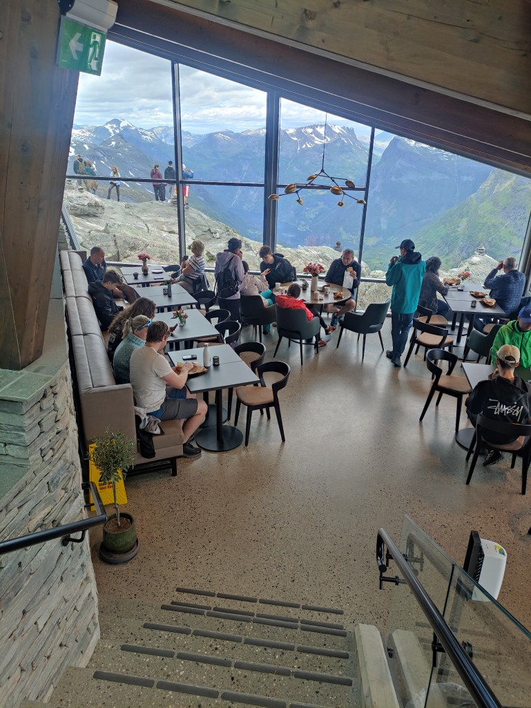 Arrivati alla piattaforma, l’emozione è indescrivibile. Il Geiranger Skywalk è una passerella in acciaio con parapetto in vetro che si protende oltre la montagna, offrendo una vista panoramica del fiordo sottostante e delle montagne che lo circondano. È un’esperienza che fa sentire piccoli di fronte alla grandiosità della natura. Il panorama da qui è spettacolare, con il fiordo che si snoda a serpentina tra le vette, creando un contrasto incredibile tra l’azzurro dell’acqua e il verde delle foreste spruzzate di neve.